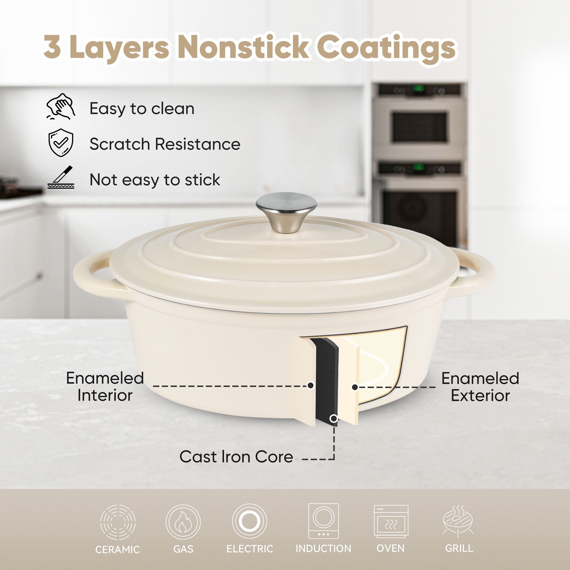 ��LARGE 4.5-QT CAPACITY: The oval dutch oven with a diameter of 11.4 inches and a capacity of 3.5 liters meets all the needs of daily stewing, don't worry about even family gatherings. It can be used in various cooking methods, such as stewing, cooking, baking, etc.The highest temperature tolerance is as high as 500°F.