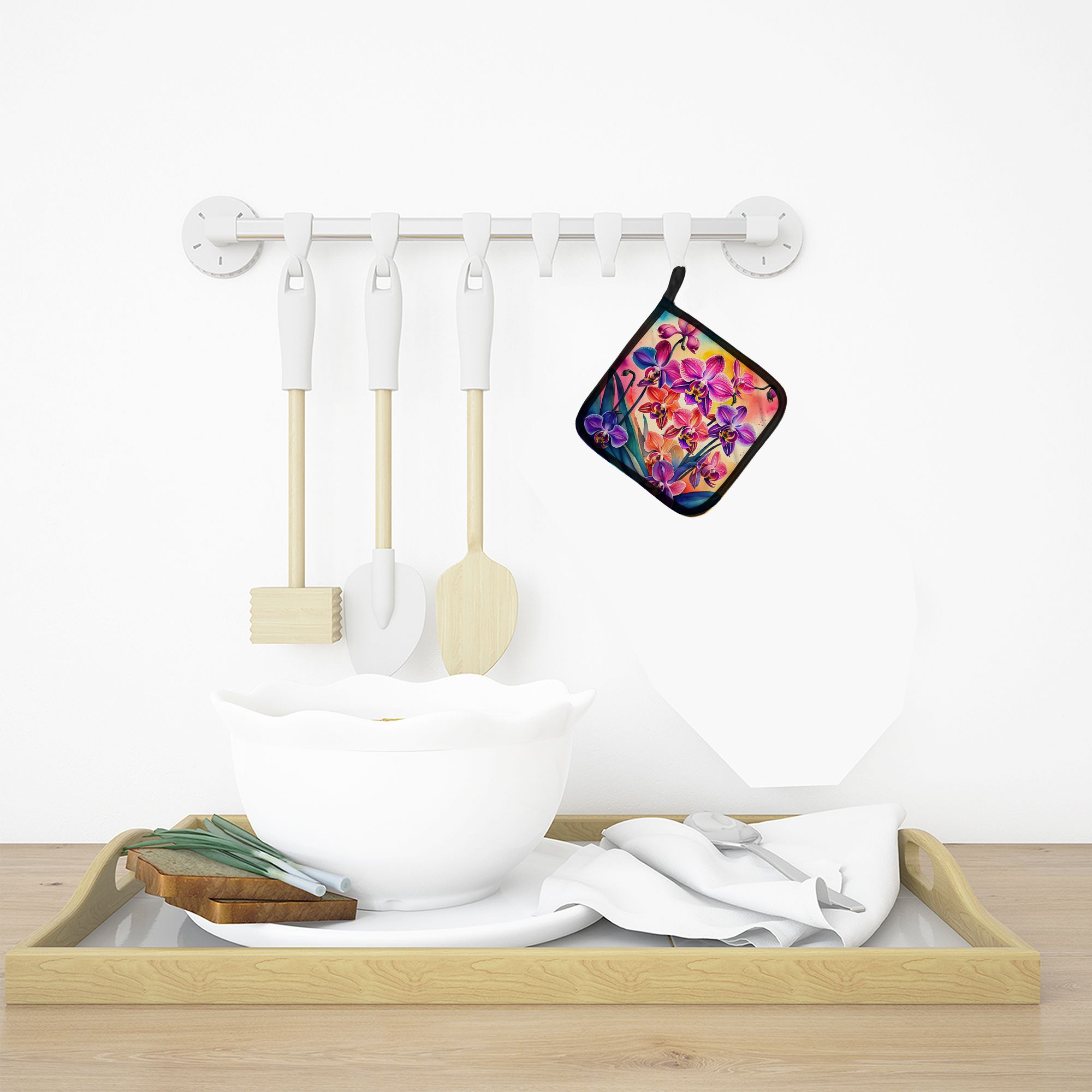 Pair of Pot Holders featuring breed specific Orchids artwork. A Pair of Pot Holders to match your kitchen decor. Made in the USA these are thick and functional. Full color artwork decorates the front polyester fabric of the hot pad and accented by a black trim. Use these at as a trivet for your Thanksgiving or Christmas tablescape. Filled with insulated fabric and quilted for durability. These colorful pot holders will make a great gift for your favorite home cook or executive chef. Each pot holder measures approximately 7 1/2 inches by 7 1/2 inches. A hanging tab is included.