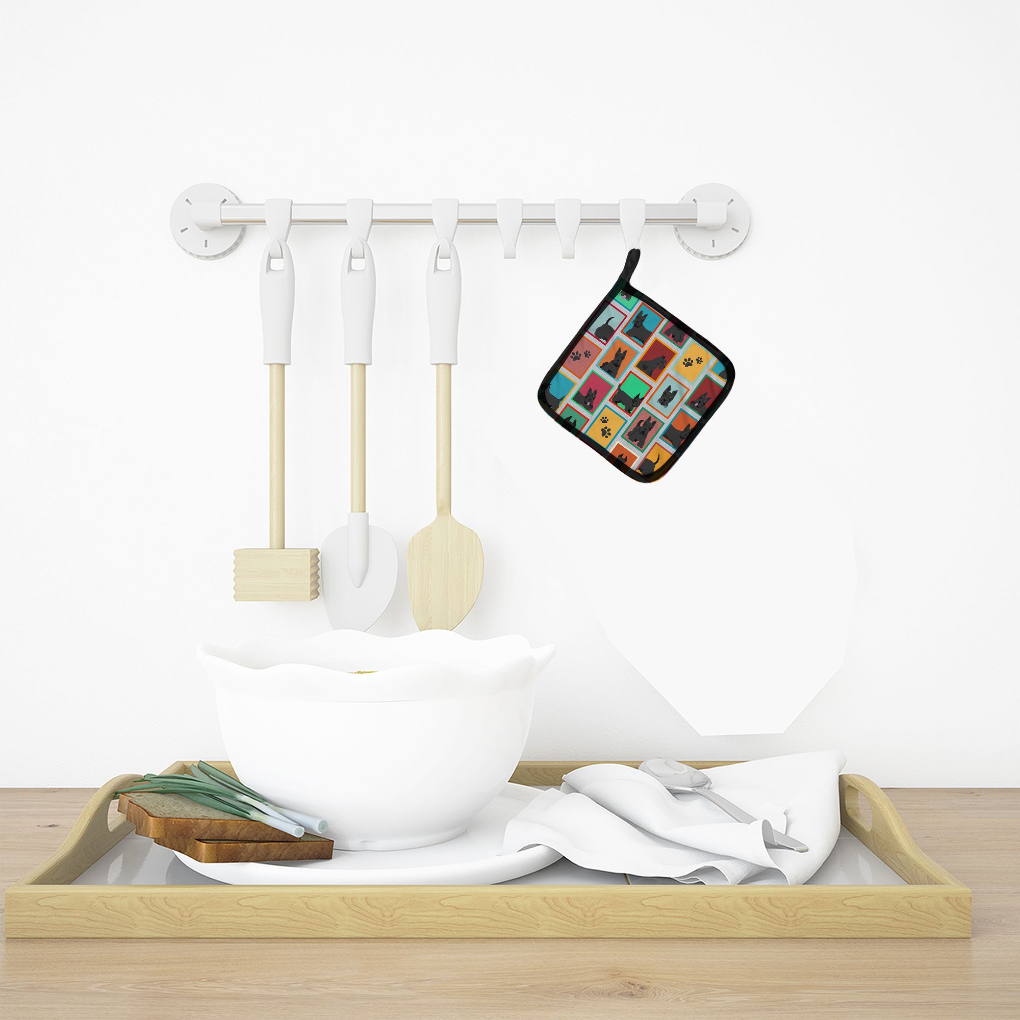 Pair of Pot Holders featuring breed specific Scottish Terrier artwork. A Pair of Pot Holders to match your kitchen decor. Made in the USA these are thick and functional. Full color artwork decorates the front polyester fabric of the hot pad and accented by a black trim. Use these at as a trivet for your Thanksgiving or Christmas tablescape. Filled with insulated fabric and quilted for durability. These colorful pot holders will make a great gift for your favorite home cook or executive chef. Each pot holder measures approximately 7 1/2 inches by 7 1/2 inches. A hanging tab is included.